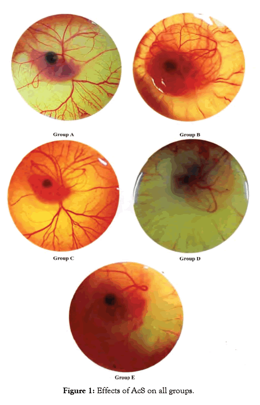 This research work was done for the evaluation of angiogenic and anti-angiogenic property of AcS. AcS was purchased from sigma Aldrich. Blood vessels were recorded through DSL Camera. A 0.9% normal saline solution, which was bought from Searle Pakistan Pvt Limited, is used as a medium for dilutions of drug. Fertilized eggs were bought from local hatchery Big Bird Pvt Ltd. Injections into the CAMs vasculature were made through Microliter Syringes fortified with 33-G metal needles. Fertilized eggs (5 days old) of chicken were obtained from a local hatchery Big Bird Poultry Pvt Limited. They were incubated at 37°C with humidity of 55-60%. Then, on fifth day of incubation, small window of about 2 cm of diameter were created by removing the shell and then internal shell membrane. It was done under aseptic conditions. Five groups were formed. Group A was given 0.1 ml Phosphate Buffer Saline (PBS) and kept as control, group B, C, D and E were given 0.64 mg/0.1 ml, 0.32 mg/0.1 ml, 0.16 mg/0.1 ml and 0.08 mg/0.1 ml respectively. Then pH of all solutions was checked with pH meter and was adjusted to 6-7.4. In order to reduce chance of contamination all the prepared solutions were filter by 0.2 μ syringe filters. On 6th day, the prepared dilutions of AcS were injected and eggs were again affixed with paraffin film in sterile setting. These were put back in incubator for following 24 hours. After twenty four hours, eggs were taken out from incubator and picture of all eggs i.e., control as well as those contracts with all doses of AcS were produced by using a DSL camera. The growth of blood vessels and other characteristics were evaluated by used Adobe Photoshop version 7.0, and then these pictures were shift to Scan Probing Image Processing (SPIP) software 6.6.2. The diameters of primary, secondary and tertiary blood vessels were measured. The framework described the extent of inhibition of naturally developing CAM includes, the diameter and branching system of blood vessels measured as per mm, and categories of blood vessels, i.e., primary, secondary and tertiary blood vessels. Individual x, y and z measurements of every picture were stacking for decided diverse parameters to evaluate angiogenesis. The widths of different blood vessels were measured by utilizing adjustment and estimation command.
