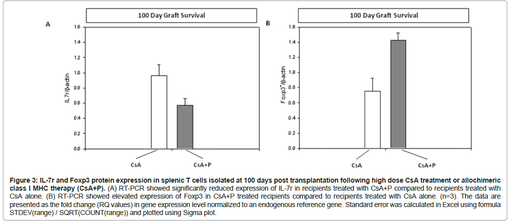 Figure 3: IL-7r and Foxp3 protein expression in splenic T cells isolated at 100 days post transplantation following high dose CsA treatment or allochimeric class I MHC therapy (CsA+P). (A) RT-PCR showed significantly reduced expression of IL-7r in recipients treated with CsA+P compared to recipients treated with CsA alone. (B) RT-PCR showed elevated expression of Foxp3 in CsA+P treated recipients compared to recipients treated with CsA alone. (n=3). The data are presented as the fold change (RQ values) in gene expression level normalized to an endogenous reference gene. Standard error was calculated in Excel using formula STDEV(range) / SQRT(COUNT(range)) and plotted using Sigma plot.
