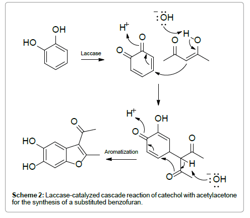 Laccasesare a class of copper-containing enzymes that have been used extensively over the past decade to perform cascade reactions owing to their ability to create reactive intermediates via the oxidation of compounds such as catechols, hydroquinones, and various aromatic amines. A noteworthy examplethat has received much attention of late is the oxidation–Michael addition-cyclization of substituted catechols with a variety of 1,3-dicarbonyl compounds to produce substituted benzofurans (Scheme 2) [3]. Cocatalytic systems involving the use of an additional enzyme, tyrosinase [4] or a lipase [5], have also been developed for the synthesis of substituted benzofurans and the results show an increase in product yield from the cascade reaction when the action of two enzymes are combined.The laccase-catalyzed cascade reaction approach has proved to bea useful synthetic method in the synthesis of the anticancer compound vinblastine. This approach involves the oxidative–domino reaction between catharanthine and vindoline to yield the bioactive compound vinblastine after a final reducing step [6]. This result proved that it was possible to synthesize important biologically active compounds viaan enzyme initiated cascade reaction. For other laccase-catalyzed cross-coupling domino reactions, refer to a recent review written by Monti et al. [7].