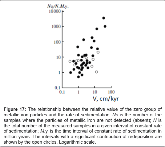 Figure 17: The relationship between the relative value of the zero group of metallic iron particles and the rate of sedimentation. No is the number of the samples where the particles of metallic iron are not detected (absent); N is the total number of the measured samples in a given interval of constant rate of sedimentation; M.y. is the time interval of constant rate of sedimentation in million years. The intervals with a significant contribution of redeposition are shown by the open circles. Logarithmic scale.