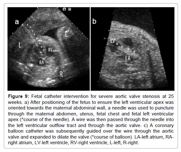 Figure 9: Fetal catheter intervention for severe aortic valve stenosis at 25 weeks. a) After positioning of the fetus to ensure the left ventricular apex was oriented towards the maternal abdominal wall, a needle was used to puncture through the maternal abdomen, uterus, fetal chest and fetal left ventricular apex (*course of the needle). A wire was then passed through the needle into the left ventricular outflow tract and through the aortic valve. c) A coronary balloon catheter was subsequently guided over the wire through the aortic valve and expanded to dilate the valve (*course of balloon). LA-left atrium, RA-right atrium, LV-left ventricle, RV-right ventricle, L-left, R-right.