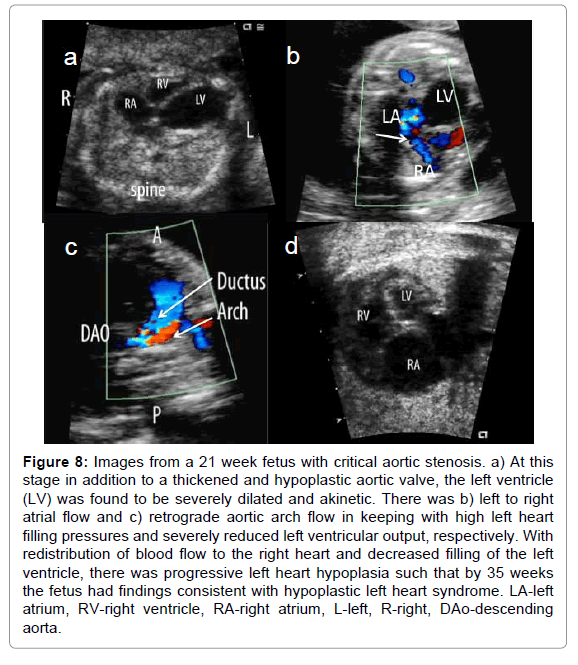 With increasing and earlier detection of fetal heart disease and serial observations, fetal echocardiography has importantly contributed to our understanding of the evolution of the spectrum of cardiovascular pathologies observed after birth [82,83]. We now know that critical outflow tract obstruction in the absence of severe atrioventricular valve insufficiency in the mid trimester fetus is often associated with the evolution of a hypoplastic ventricle and great artery ipsilateral to the obstruction [83-89]. We have also learned that functional abnormalities involving only one ventricle may also be associated with abnormal growth and progressive hypoplasia of the affected ventricle and may contribute as an etiology to such conditions as hypoplastic left heart syndrome (Figure 8) [90,91]. Ventricular outflow obstruction may progress as a primary lesion in isolation or be associated with more complex congenital heart disease such as tetralogy of Fallot. It may also evolve secondary to altered flow as is true for pulmonary outflow obstruction in Ebstein anomaly [27] and in the recipient twin in twintwin transfusion syndrome [91]. Atrioventricular and semilunar valve regurgitation and stenosis may progress and lead to more severe secondary disease including a dilated and dysfunctional ventricle, and the evolution of fetal heart failure [27-30,34] Although most structural fetal heart lesions either remain unchanged or progress, rarely there is resolution of cardiovascular pathology including progressive diminution and even closure of ventricular septal defects [90] or normalization of discrepant ventricles and great arteries detected earlier in gestation [60]. Myocardial dysfunction and arrhythmias may develop or progress in the presence or absence of structural heart disease and cardiac tumors may develop. Cardiovascular pathology may even evolve as a consequence of the abnormal intrauterine milieu. The lesions that best represents the latter is hypertrophic cardiomyopathy observed in the diabetic pregnancy which may be observed even in the late first, early second trimester [93], and we have recently found to persist even in late infancy (unpublished data). The recipient twin in twin-twin transfusion syndrome, as well, develops increased medial thickening of the systemic vascular bed and significant biventricular hypertrophy and dysfunction secondary to unique vascular placental connections between donor and recipient twins [94,95] which resolve weeks after delivery [95,96]. Knowledge of the natural history including the potential for progression of fetal heart disease has become a critical part of the counseling of affected pregnancies, has improved counseling with respect to recurrence of pathology in subsequent pregnancies, and has led to the desire to develop interventional strategies that improve the ultimate outcome of affected pregnancies.