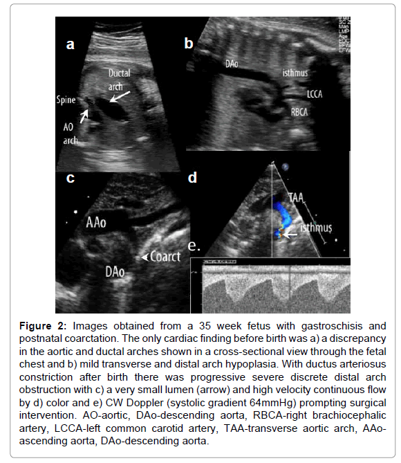 Figure 2: Images obtained from a 35 week fetus with gastroschisis and postnatal coarctation. The only cardiac finding before birth was a) a discrepancy in the aortic and ductal arches shown in a cross-sectional view through the fetal chest and b) mild transverse and distal arch hypoplasia. With ductus arteriosus constriction after birth there was progressive severe discrete distal arch obstruction with c) a very small lumen (arrow) and high velocity continuous flow by d) color and e) CW Doppler (systolic gradient 64mmHg) prompting surgical intervention. AO-aortic, DAo-descending aorta, RBCA-right brachiocephalic artery, LCCA-left common carotid artery, TAA-transverse aortic arch, AAoascending aorta, DAo-descending aorta.