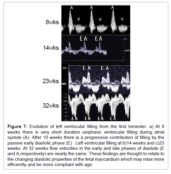 Finally, early fetal echocardiography has provided unique insight into the evolution of fetal heart function from the early first trimester. It has been shown that the ventricles fill in the embryonic heart only during atrial systole, and this filling is of very short duration with prolonged isovolumic relaxation and contraction times (Figure 7), suggesting less efficient ventricular relaxation and less compliance as well as greater afterload and/or less efficient contractility in the early fetal heart, respectively [76-78]. After 10 weeks and continuing to term, there is an increasing contribution of ventricular filling from the more passive early diastolic phase suggesting there is at least improved ventricular relaxation with maturation. We have also recently discovered that there is forward flow in the great arteries during atrial systole with greater atrial systolic flow. This diastolic flow in the great arteries accounts for up to 40% of the total forward flow in the great arteries in some fetuses observed at <10 weeks [79]. Thus atrial systole may even contribute to cardiac output as a consequence of the restrictive nature of the early fetal myocardium. Animal models of altered atrial contractility, which lead to demise of the embryo, provide further support the critical nature of atrial function in the early fetus [80,81].